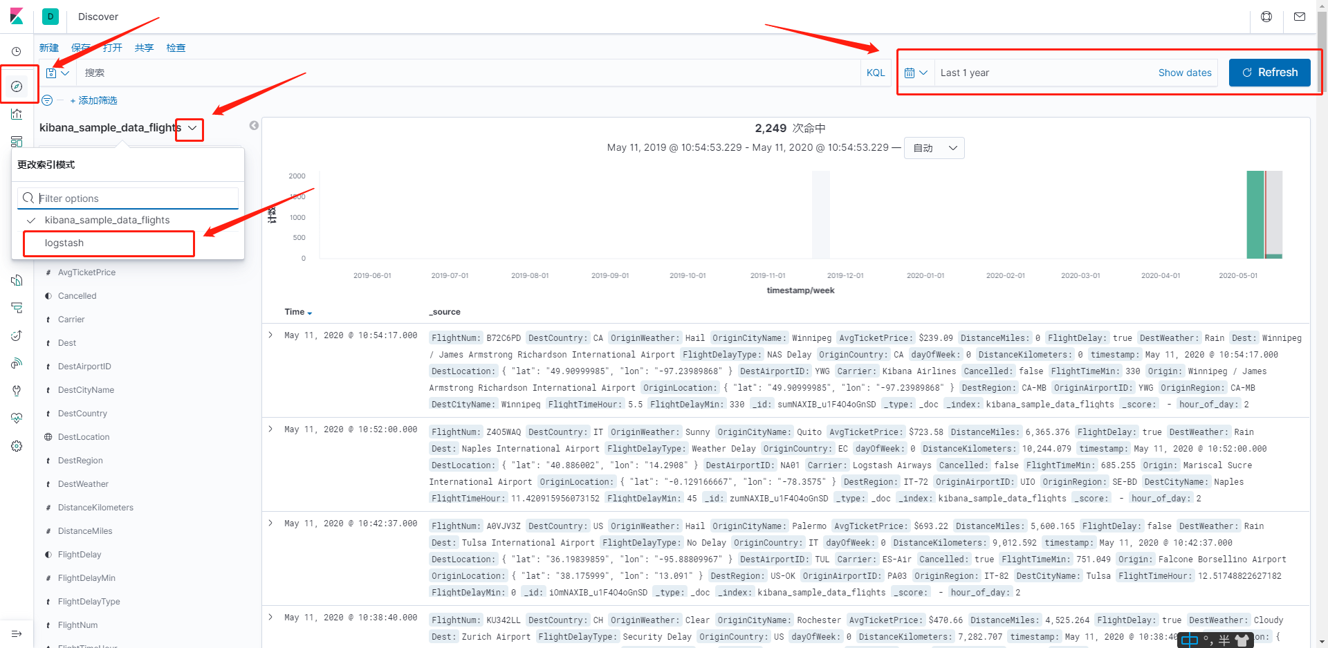 然后左侧菜单栏的第二个按钮,进入Discover页面,选择logstash索引,此时可能会发现,哎?怎么没数据,那就请注意你的右上角时间筛选是否默认为最近十五分钟了,更改时间筛选条件后再次查询,就可以顺利查到你刚才在logstash里面传进去的消息啦!