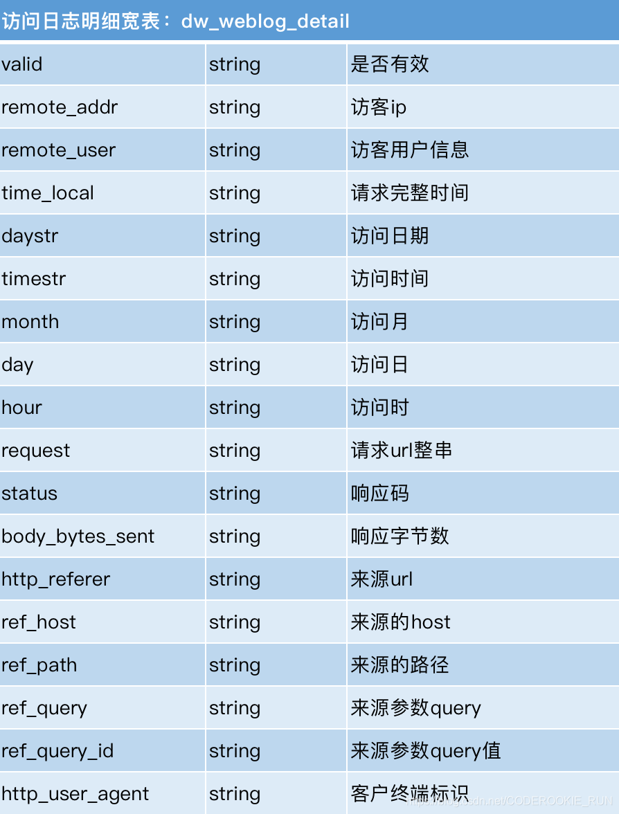 为了方便统计,将time_local拆分为daystr,timestr,month,day,hour五个字段,将http_referer拆分为ref_host,ref_path,ref_query,ref_query_id四个字段
