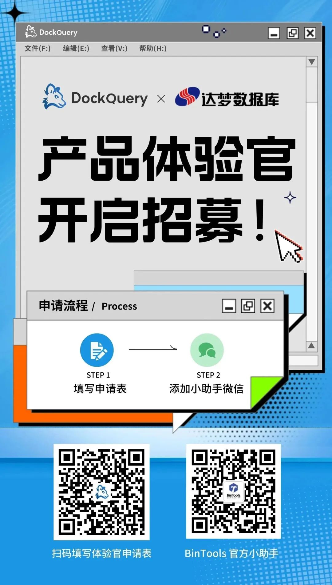 此外,为快速推进对达梦数据库的支持力度,DockQuery现面向达梦社区招募专项体验官!如果你有针对达梦数据库客户端的需求,欢迎加入DockQuery天狼专项体验官!扫描海报中二维码即可报名!