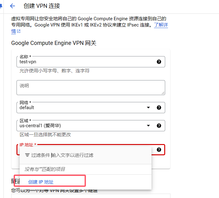 在google cloud中搜索 Network Connectivity->VPN:新建VPN -> 选择传统VPN (高可用性那个没有搞定他)-> 在: Google Compute Engine VPN 网关中 创建IP地址。记录下这个ip地址。