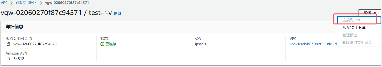 注意:虚拟私有网关创建成功后,需要连接到VPC(你redis所在的VPC):