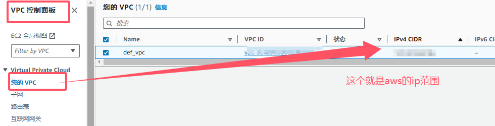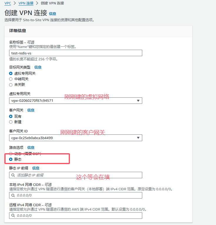 3:路由选项-》基于路由-》这里需要填写:远程网络 IP 地址范围。(这个得去aws找:在Aws中-》VPC-》选中VPC-》IPv4 CIDR)。将他填入这里。