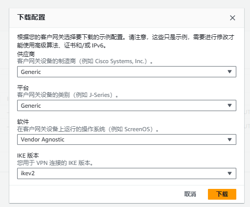 VPN面板-》站点到站点VPN链接-》创建 VPN 连接:图中的需要填,其他默认。创建完成后,选择VPN-》右上角有个下载配置。