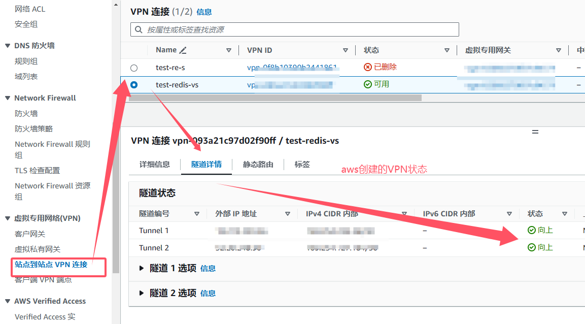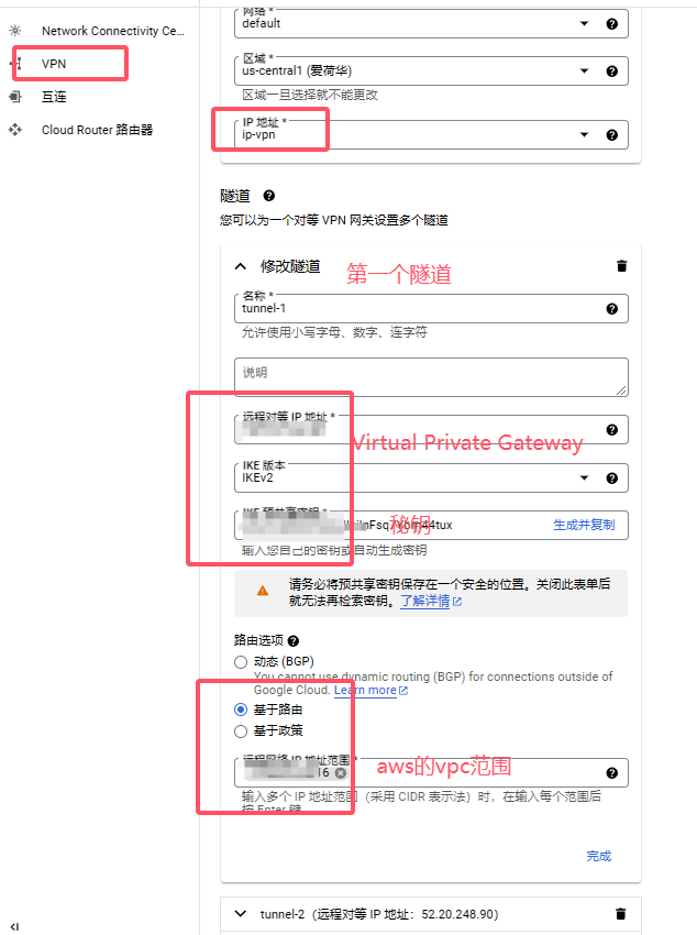 2:接着创建两个隧道-》远程对等IP(就是刚刚从aws下载的文件中:Virtual Private Gateway :),IKE版本V2,IKE秘钥也在刚刚下载的文件中:Pre-Shared Key。注意:文件中有两个Virtual Private Gateway和Pre-Shared Key,分别用来创建两个隧道,不要用错了,ip和秘钥是一一对应的。