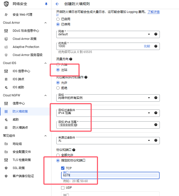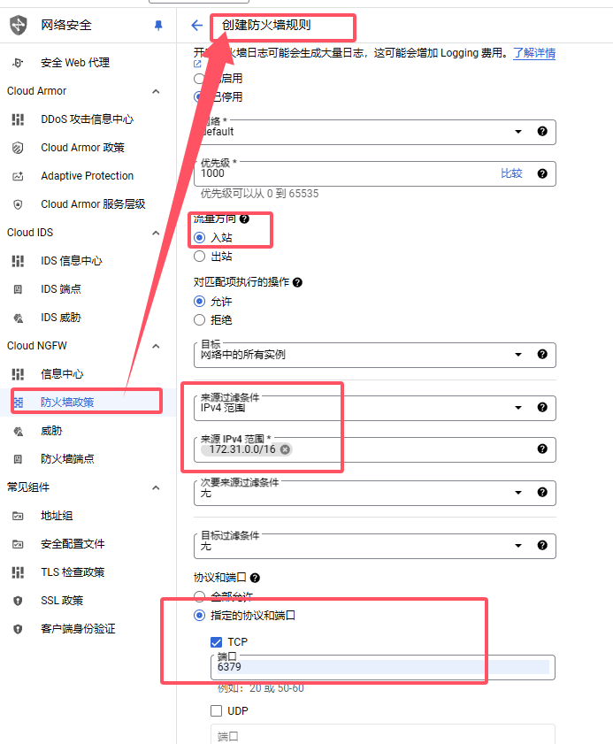 1:google cloud设置防火墙:入站-》来源ip范围填AWS VPC那个Ipv4 CIDR(上面在aws中找到的那个)。端口选-》tcp-》6379。