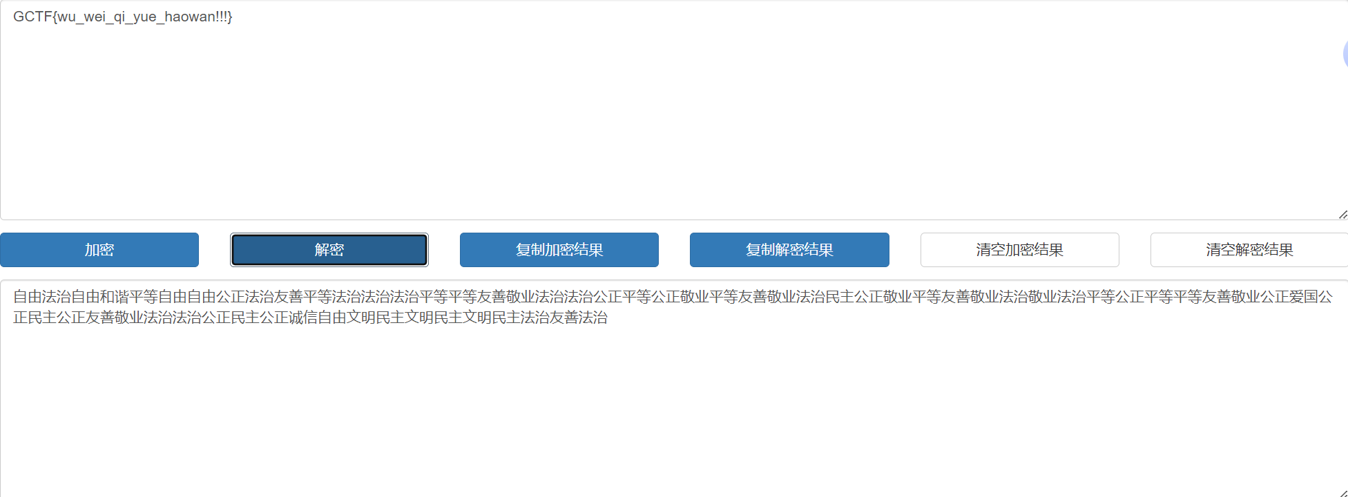 下载附件,一张图片,拖进010,在文件尾看到隐藏文本,提取并用社会主义价值解密