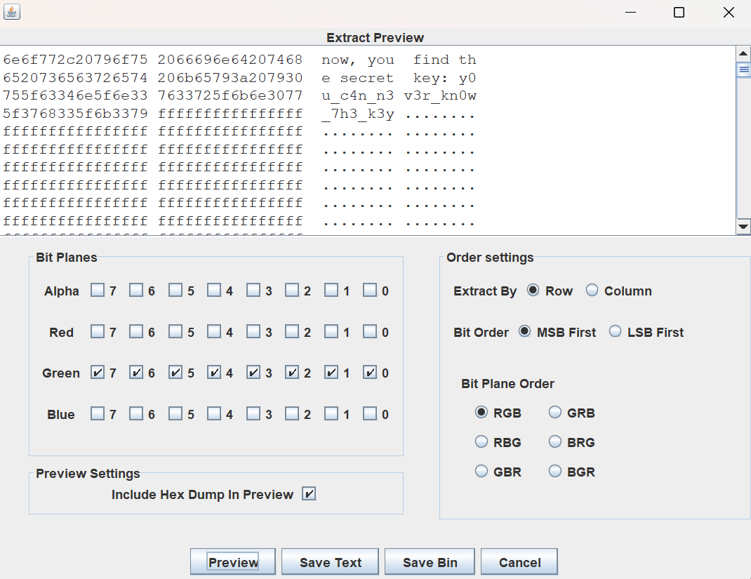 提示为结合题目进行想象,我们会想到取证第一步vc挂载,但是需要密码,研究图片,lsb隐写,在row:G通道找到密钥