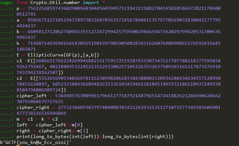 c2 = (55526569053402697811523099820610338430800152093428843463015712899070451620897 : 60523238843668948261533610341946158184574959321865109372495508584794806989724 : 1) cipher_left = 53849857630899617966127718792148796514724188262128669062866230792068679727635 cipher_right = 27732384893837974040803834222639325311271071577349345606901477238226516946069