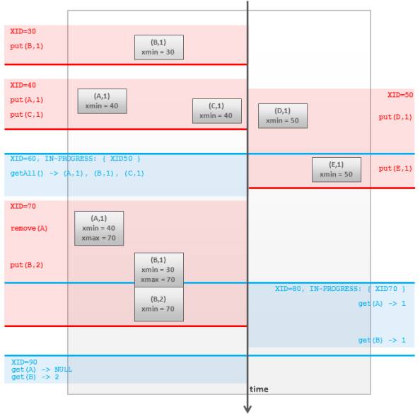 正如前面所说,每个事务可以对应于一个部分数据快照。在同一时间,每一个数据项都有他自己的生命周期 - 从加入缓存到移出缓存或者被更新(被新版本所取代)。所以可以通过给每条数据打两个时间戳来实现隔离,每个事物通过开始时间(两个时间戳之一,译者注)来找出在事务开始时处于可见状态的数据。但在实践中常用一个单调递增的计数来代替时间戳: