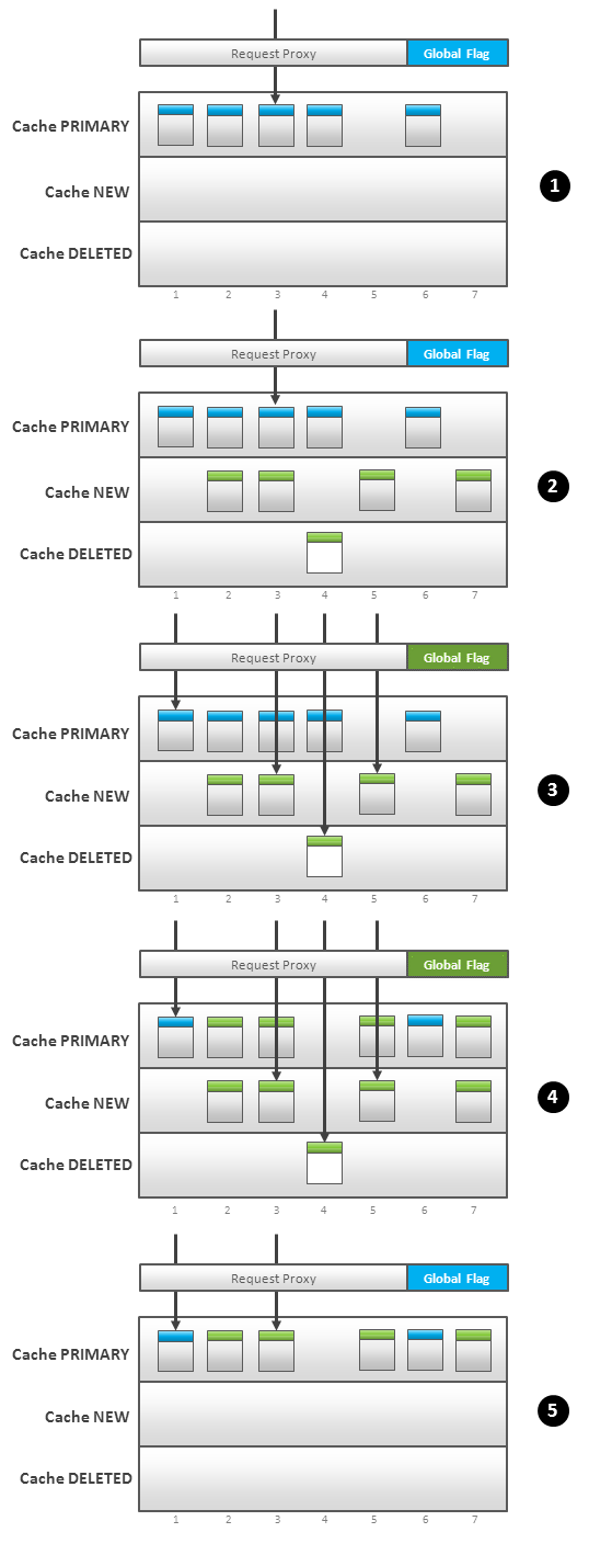 提交进程(特指写事务)切换全局标示,这个标示会告诉代理接口先去"NEW"和"DELETE"缓存去查找所请求的数据,如果在这两个区域中没有发现再去"PRIMARY"缓存查找(图2.3)。换句话说,在这一步所有的请求都被改派到了更新过的数据中查找。