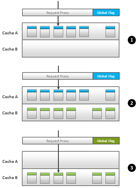 最简单的例子是把所有数据都加载进缓存里,然后通过一个代理接口来执行诸如 get() 和 put() 这样的操作。这个接口会与两个缓存打交道,A和B,按照以下逻辑运行(图 1):