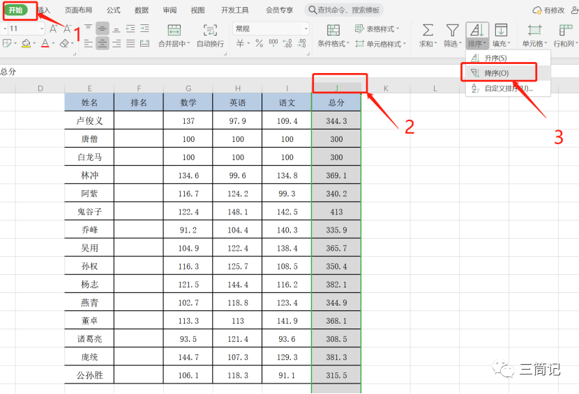 - 第一步在【开始】选项卡下选中J列总分列(移到【J】单击),下图为选中效果,再点击【排序】下的【降序】排列。