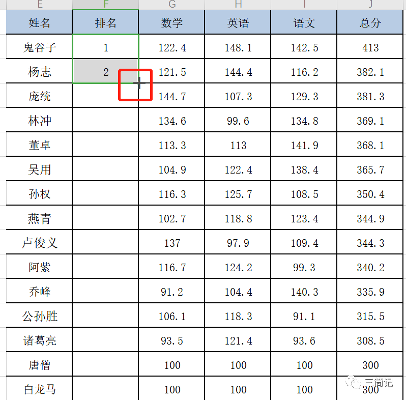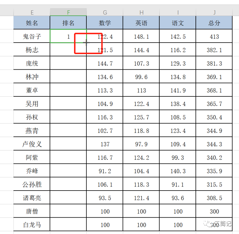- 第三步:在排名F2单元格内输入1,选中F2单元格,鼠标移到F2单元格的右下角,出现实心的黑色【+】号,双击填充。