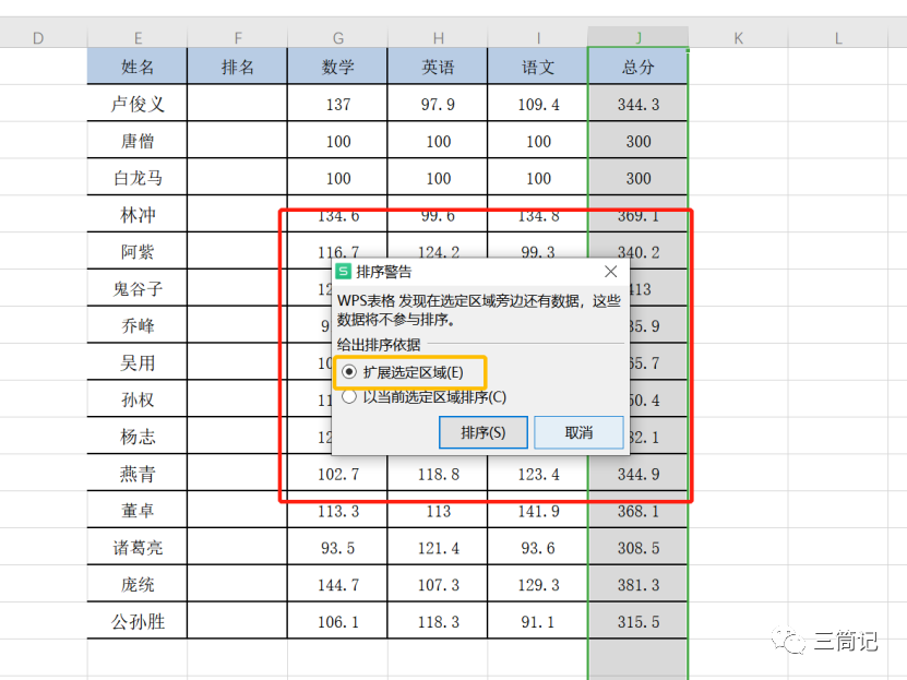- 第二步:出现弹框,选中扩展选定区域总分单元格所在行的数据会根据总分的排序一起排序,而不是只排序当前选中区域),点击【排序】。