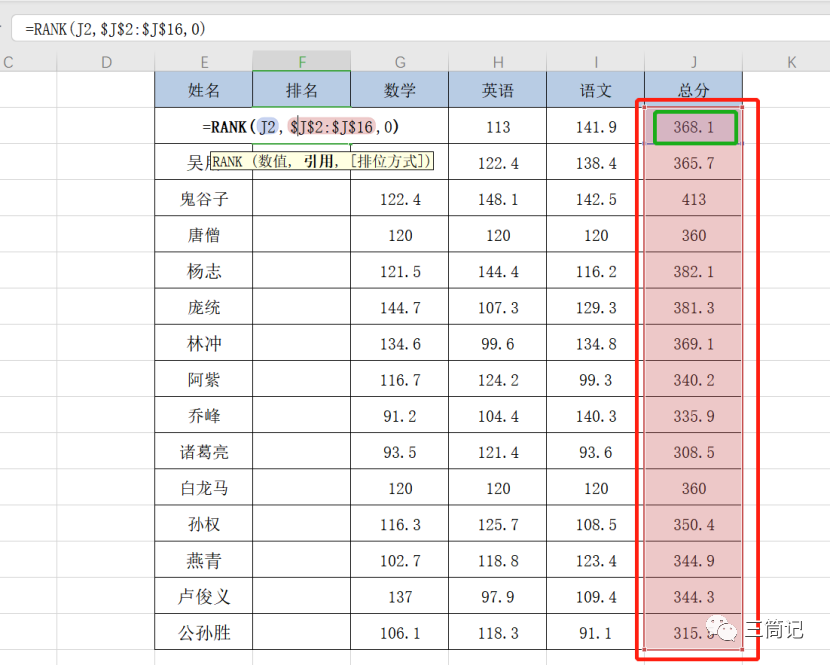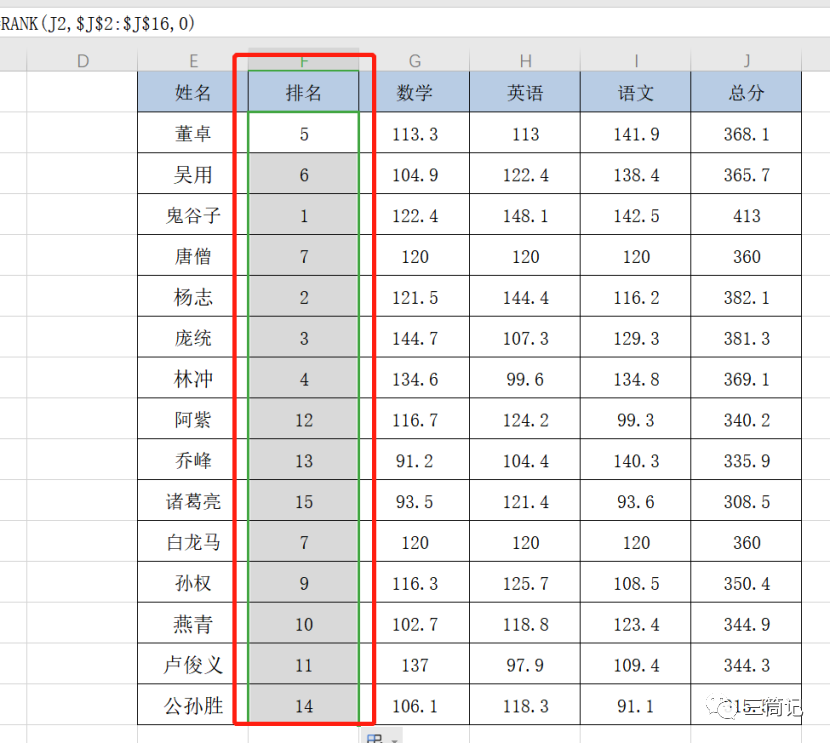 如果想将新出的排名从1到N按照升序排列,则可参考方法场景一的方案对F列【排名列】升序排列或者J列【总分列】降序排序,即可实现,结果如下图:
