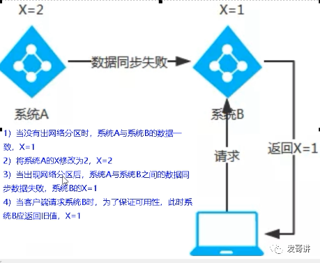当网络分区出现后,为了保证可用性,系统B可以返回值,保证系统的可用性,结论:违背了一致性C的要求,只满足可用性和分区容错,即AP。