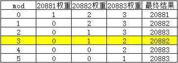 因为weightSum=6,所以列举mod不同值时,最终的选择结果和权重变化: