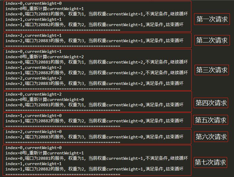 第六次循环时,mod为0,循环对象是20883端口的服务,权重为2,满足条件①,返回当前20883端口的服务,此时各端口的权重情况如下: