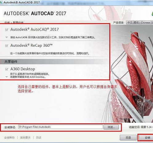5、进入软件的组件和路径选择界面,非专业人士建议不要去勾选,同时为了方便接下来的破解,也不建议更改。建议直接默认点击“安装”