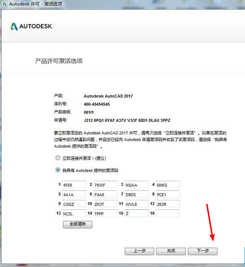 8、完成点击,在注册机的Activation栏中即生成激活码,将该生成码鼠标右键复制,然后再次回到刚才的安装界面,将其复制到安装界面中的15个空白的框中,完成点击“下一步”