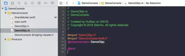 注意在Objc的类加入Swift的头文件,其格式是[项目名]-Swift.h,然后进入这个文件,可以很容易找到定义在Main.swift里的TestModel类