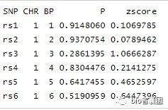 1、准备包含SNP, CHR, BP, P的文件gwasResults(如果没有zscore可以不用管),如下所示: