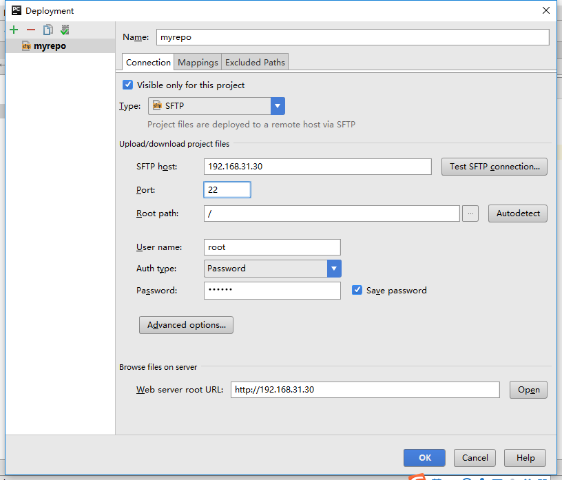 其中Root path:是远端服务器上部署程序的根目录,不需要更改。