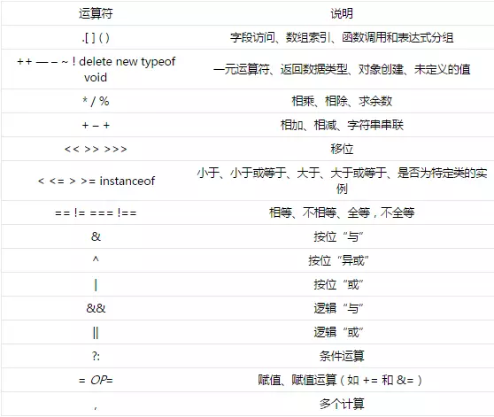 首先要运用到的第一个知识就是js运算符的优先级,因为这么长一段运算看的人眼花,我们必须得先根据优先级分成n小段,然后再各个击破。优先级的排列如下表: