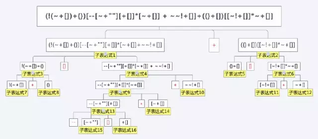 大功告成!子表达式16转化完毕,+[],最终得到0。