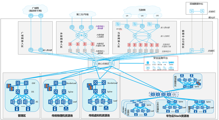 • 广域网接入区,接入企业骨干网,用于异地多数据中心互联;