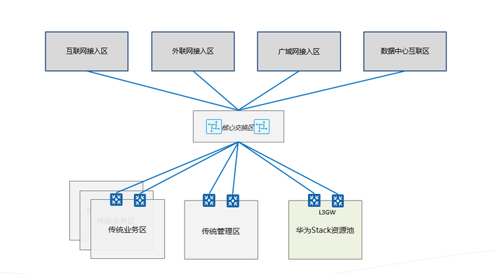 华为云Stack网络L3GW服务,可以实现云上云下一张网,云上的业务网络通过L3GW服务作为一个业务区平滑的接入到传统数据中心的网络,保证客户数据中心现有的网络架构无需改动。