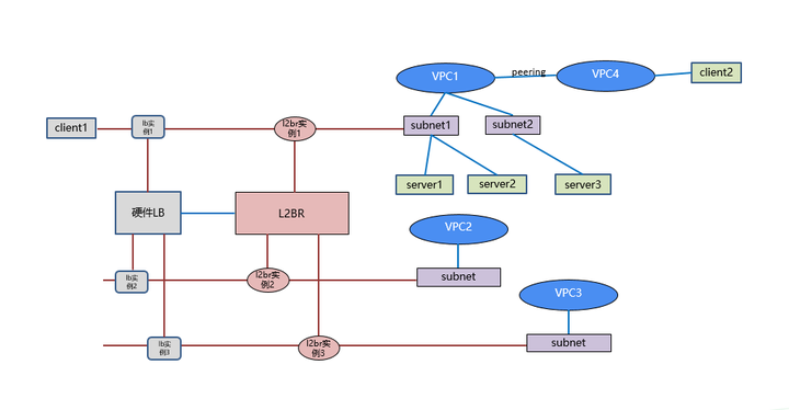如上图所示,传统硬件LB旁挂在L2BR网关上,硬件LB上配置LB实例提供LB服务,LB实例所在子网通过L2BR实例接入到云内VPC,后端server运行在云上,client可以在云外,也可以在云上。云上多个VPC可以共享硬件LB,也支持跨VPC访问LB实例。客户可以根据业务诉求按需灵活组网,既可以使用硬件设备的高级功能,也可以保持原有的操作习惯和体验。