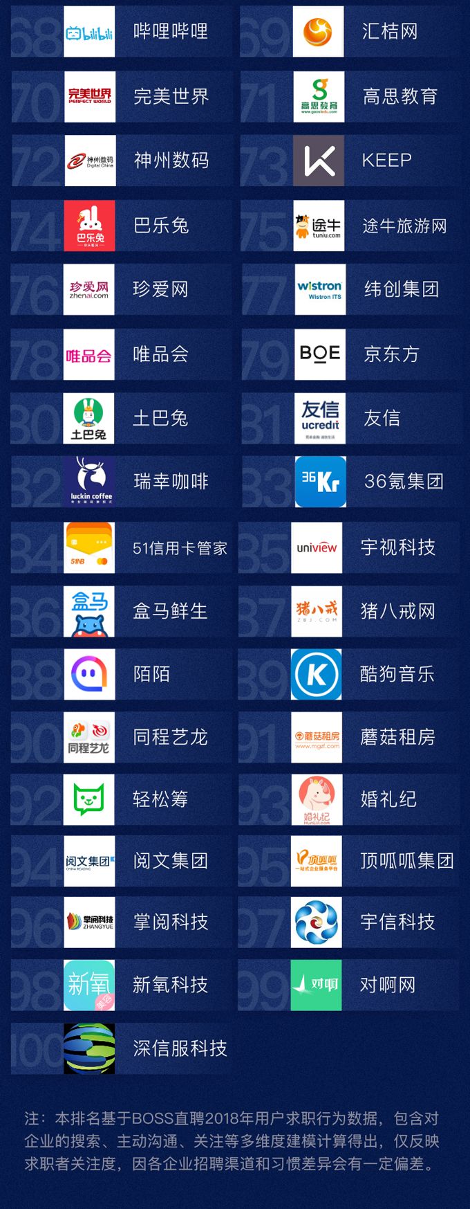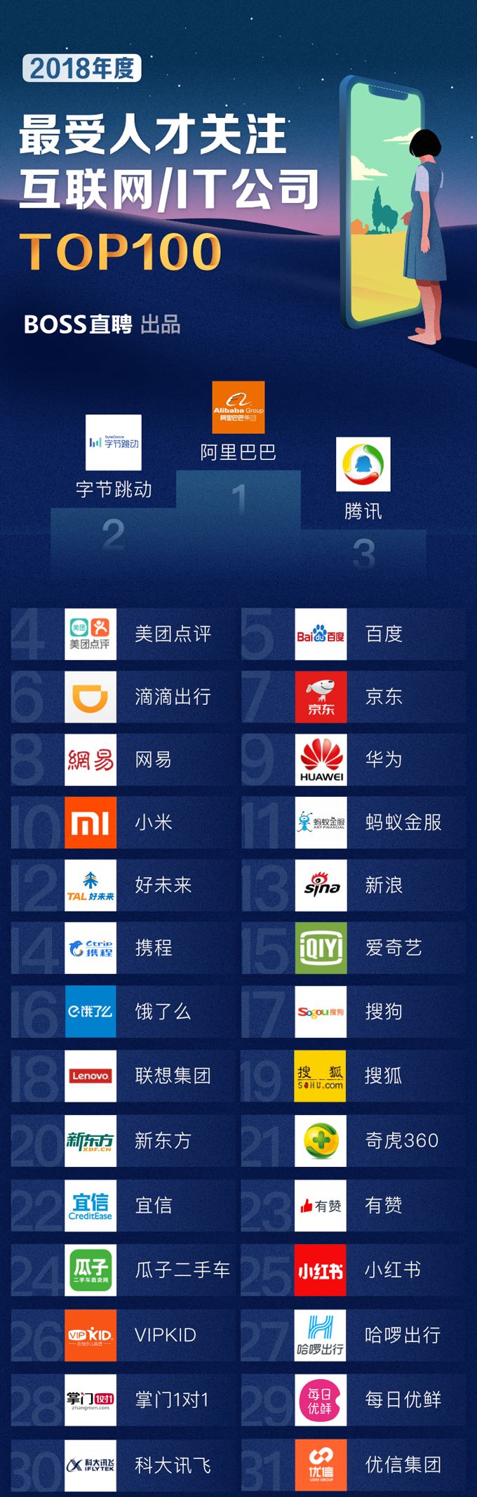 移动互联网招聘平台BOSS直聘近期发布了这份《2018年度最受人才关注互联网/IT公司TOP100》榜单,期待能为大家新一年的求职带来一些参考。