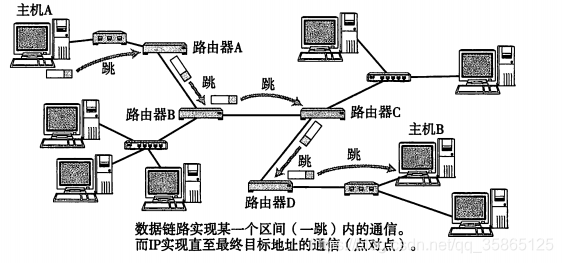 数据链路层负责两个直连设备之间的通信, 作为网络层的IP负责实现 没有直连的两个网络层 之间的通信。