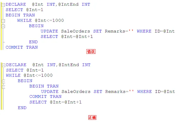 也就是说我们不应该在1000行数据都更新完成之后再commit tran,你想想你在更新这一千行数据的时候是不是独占资源导致其它事务无法处理。
