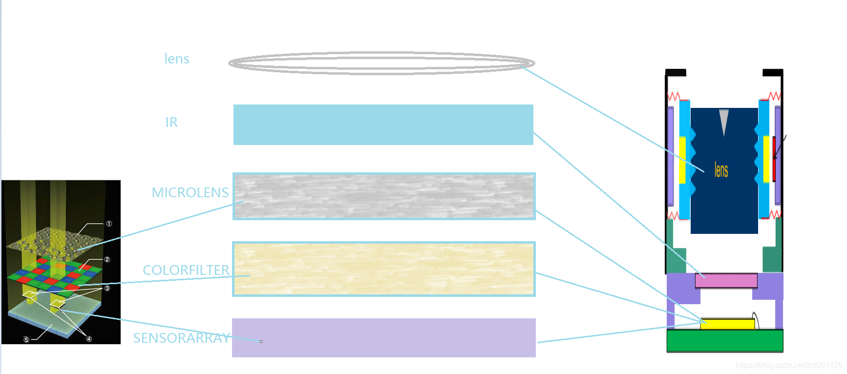 光通过LENS(镜头)投射到SENSOR,经过光电转换为模拟电信号,在A/D转换为数字信号,送到DSP处理模块做后续处理。