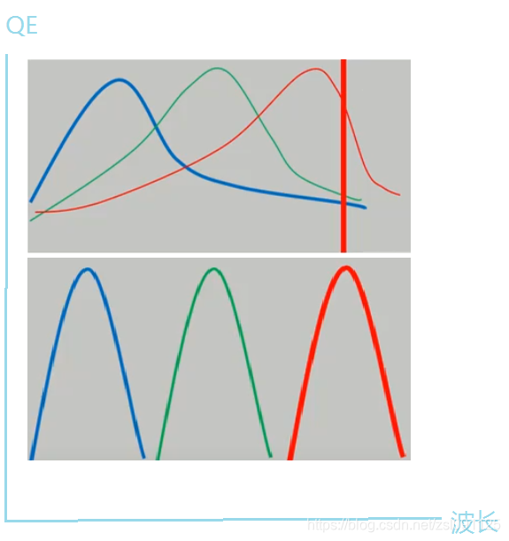 下图中上面是实际的,下面是理想的情况。上面图中同时用IR滤波器对红外频率的光进行了频率截断。避免红外光的干扰。