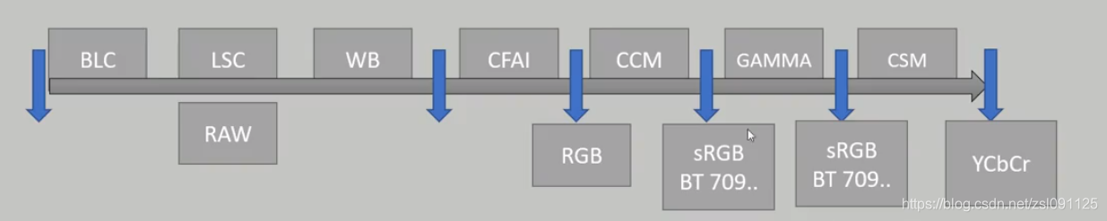 Bayer format 图像,经过黑电平补偿 ( black level compensation)、镜头矫正 ( lens shading correction)、坏像素矫正 ( bad pixel correction)、颜色插值 ( demosaic)、Bayer 噪声去除、 白平衡( awb) 矫正、 色彩矫正( color correction) 、 gamma 矫正、 色彩空间转换( RGB 转换为 YUV) 、 在 YUV 色彩空间上彩噪去除与边缘加强、 色彩与对比度加强,中间还要进行自动曝光控制等, 然后输出 YUV( 或者 RGB) 格式的数据。