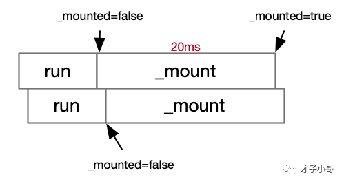 冷启动被调用多次的根本原因是Node.js不是多线程,如下图所示,假设冷启动耗时20ms,在此期间再次调用run函数,标识位_mounted还未被设置为true,就会又触发一次冷启动。