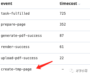 每个PDF的渲染数据体可能不同,内存占用率有波动很正常,但这么明显的尖刺就有问题了。通过查日志发现,这个时间段的某条任务触发了create-tmp-page事件,此事件只会在一种情况下发生:当worker所有page都忙时被调用执行任务,会临时创建一个page实例执行此条任务。