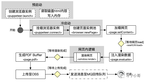 如果任务队列长时间为空会触发缓存清理逻辑,销毁browser和page实例以节省服务器资源,再次发起任务会触发冷启动。冷启动执行两件事情: