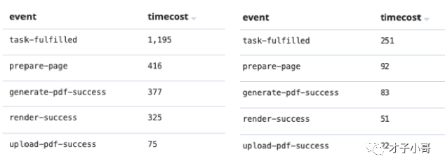 开发初期加工一份pdf的平均耗时约6s,优化之后最佳耗时能达到250ms左右,但最长耗时仍然有接近3s的任务,上下限差距巨大。细节原因还没完全定位清楚,比如渲染数据的体积与渲染耗时成正比,这点可以理解,但渲染只是完整pdf加工任务中的一环,其他环节也存在非常大的耗时波动,比如下面两条任务的对比: