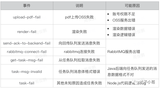 •mq_svc_err事件:代表RabbitMQ服务错误,一般是挂了,对应图中红色六边形。当Node.js与RabbitMQ服务通信失败时触发此事件;•no_idle_worker事件:代表无空闲worker是发起了任务调度,对应图中橘色六边形。正常情况下不会触发此事件,除非调度逻辑有bug,为了服务健壮性,即便此事件被触发也不会导致服务崩溃。