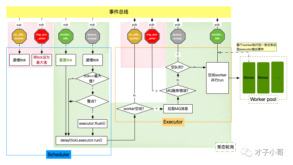 为了架构的整洁性,以上轮询策略中的所有事件的触发和响应都分别收归到Executor和Scheduler中,worker只负责干活啥都不管,这样每个角色的代码都更易迭代和维护。