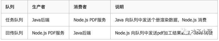 每个环节的具体流程不细讲,Node.js PDF加工服务的细节下文详解。与Node.js PDF服务相关最关键的是与Java后端的数据交互流程。Java后端与Node.js PDF服务通过 RabbitMQ 消息队列进行数据交互,建立两个队列: