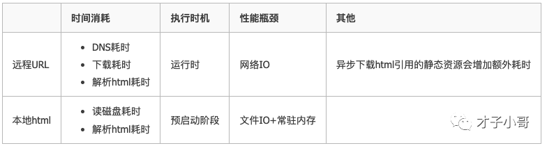 上文提到过,本地html文件在预启动阶段提前从磁盘读取存放于内存,运行时无需实时读取。所以文件IO的耗时不算在pdf加工逻辑总耗时中,而加载远程URL只能在运行时执行,会增长pdf加工的总时长。