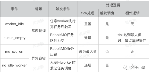 •worker_idle事件:代表有空闲worker,对应图中绿色六边形。任意worker执行完一次任务后,不论任务是否成功都会触发此事件。Scheduler监听到此事件后会重置tick为初始值,并在tick之后发起下次调度;•queue_empty事件:代表任务队列为空,对应图中灰色六边形。Node.js从MQ任务队列拉取消息为空时触发此事件。Scheduler监听到此事件后会递增tick,并在tick之后发起下次调度。