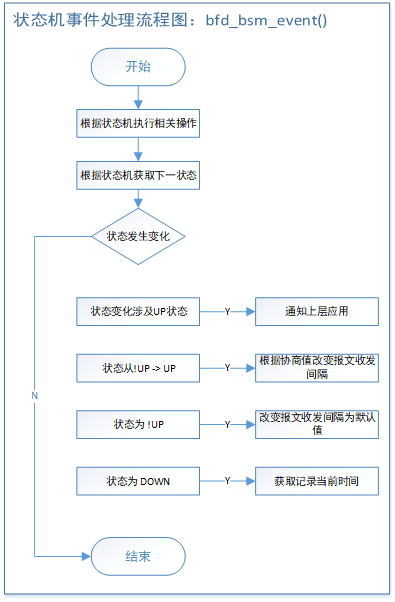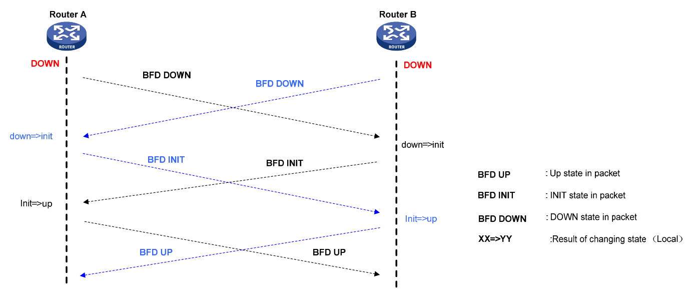 (3) 会话建立以后,BFD开始快速发送bfd控制报文,检测链路故障,并做出快速反应。