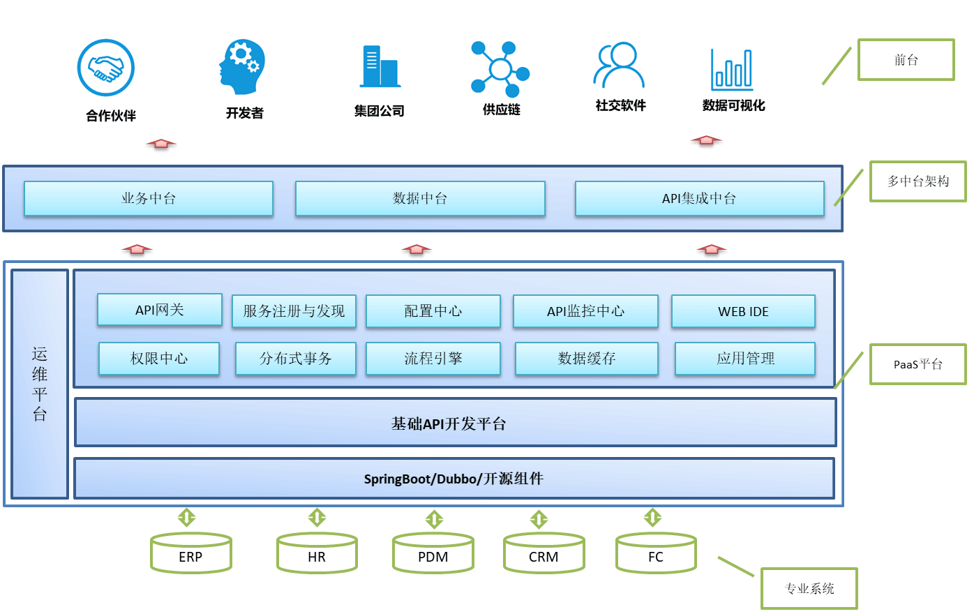 PaaS平台提供完全自主研发的服务注册中心、配置中心、组织权限体系、API网关等系列组件开箱即用,部署后即可快速进行服务的开发。