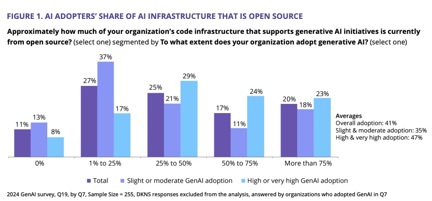 - 多数使用AI的组织已采纳开源模型,平均有 41% 的AI基础设施为开源。